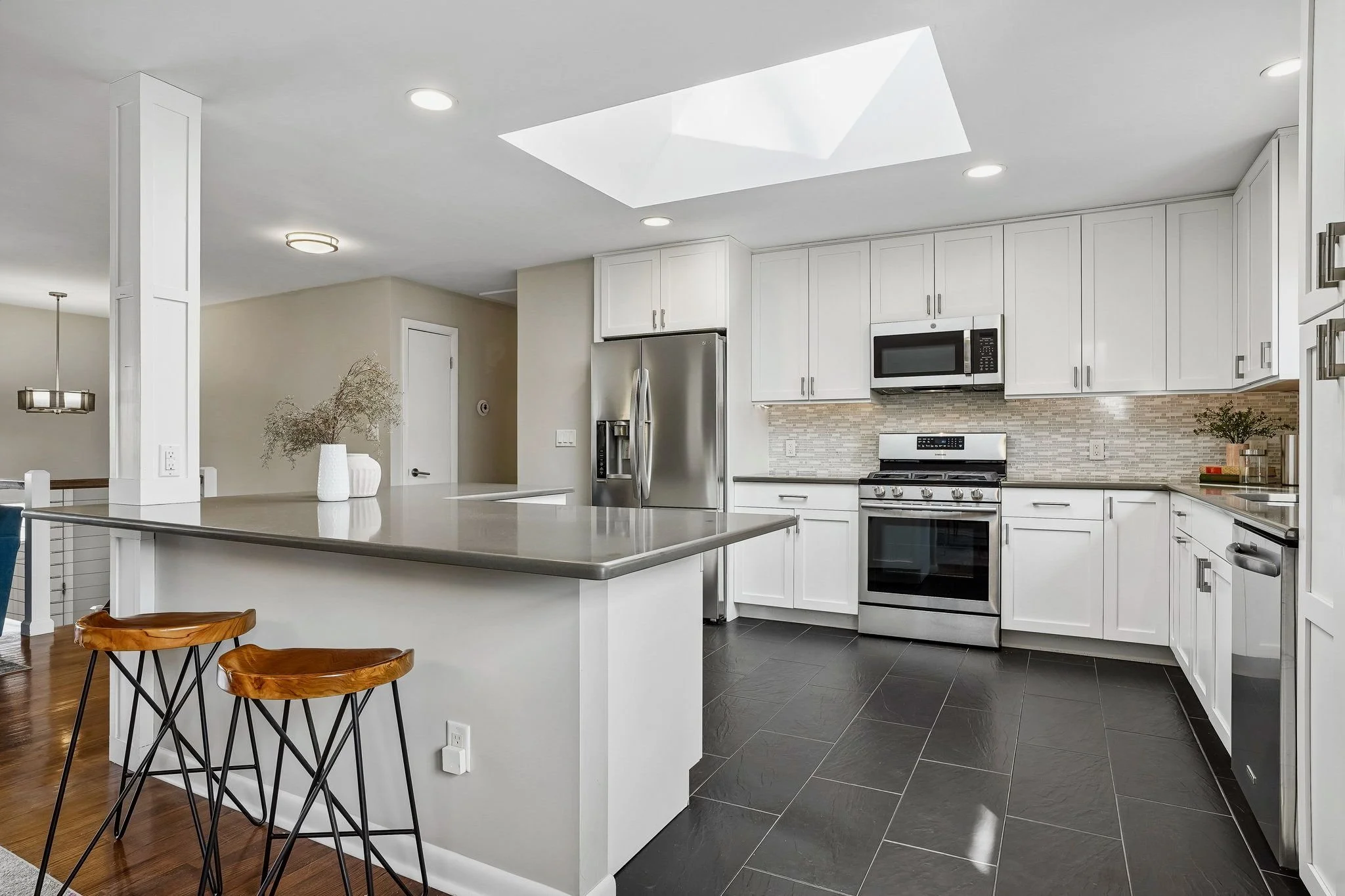Clean lines, an open-concept feel, and an easy flow give the home a sense of both function and style, with well-proportioned living space suited to both everyday living and entertaining. The renovated kitchen features quartz countertops, stainless steel appliances, and a skylight that fills the space with natural light, while large picture windows in the living room add to the home's sunny warmth. The main level includes a private primary suite, along with two additional bedrooms and a spacious hall bath. The ground floor level offers an office/fourth bedroom, and a full bath, ideal for flexible living. A family room with sliders opens to the fully fenced patio and backyard pool, providing additional space to relax and entertain. This level also includes a large laundry room with ample storage and access to the attached 2-car garage. Outside, the heated in-ground pool and patio extend the living space with inviting areas to gather, enjoy a swim, share evening BBQs, and unwind around the fire pit under the stars. Located on a quiet cul-de-sac, this home offers convenient access to NJ Transit, downtown South Orange, Flood's Hill, and the neighborhood amenities that make this such an inclusive community.