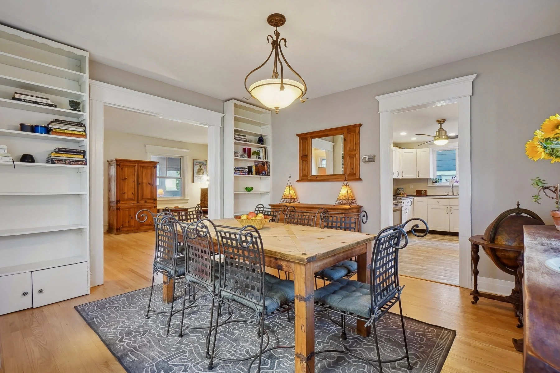 Step into the inviting enclosed three-season front porch, a delightful space to relax, and enter a gracious foyer that sets the tone for this warm home. The oversized living room boasts a stunning brick wood burning fireplace flanked by built-in bookcases, providing the perfect gathering spot. A formal dining room with classic charm flows seamlessly into the kitchen, which features a charming eat-in area, a separate pantry, and plenty of potential for modern updates. The second floor offers four spacious bedrooms, a full hall bath, and a versatile sleeping porch overlooking the backyard, currently used as a home office but brimming with possibilities. The third-floor primary suite is a private retreat, complete with a full bath, an exposed brick wall, an expansive closet, and additional storage under the eaves. The unfinished basement adds to the home's versatility, with ample storage, a laundry area, and a working toilet that could be converted into a bathroom. The fully fenced backyard offers a serene patio area, perfect for outdoor dining or play. With original architectural details including hardwood floors and built-in features, this home is filled with endless possibilities to make it your own.