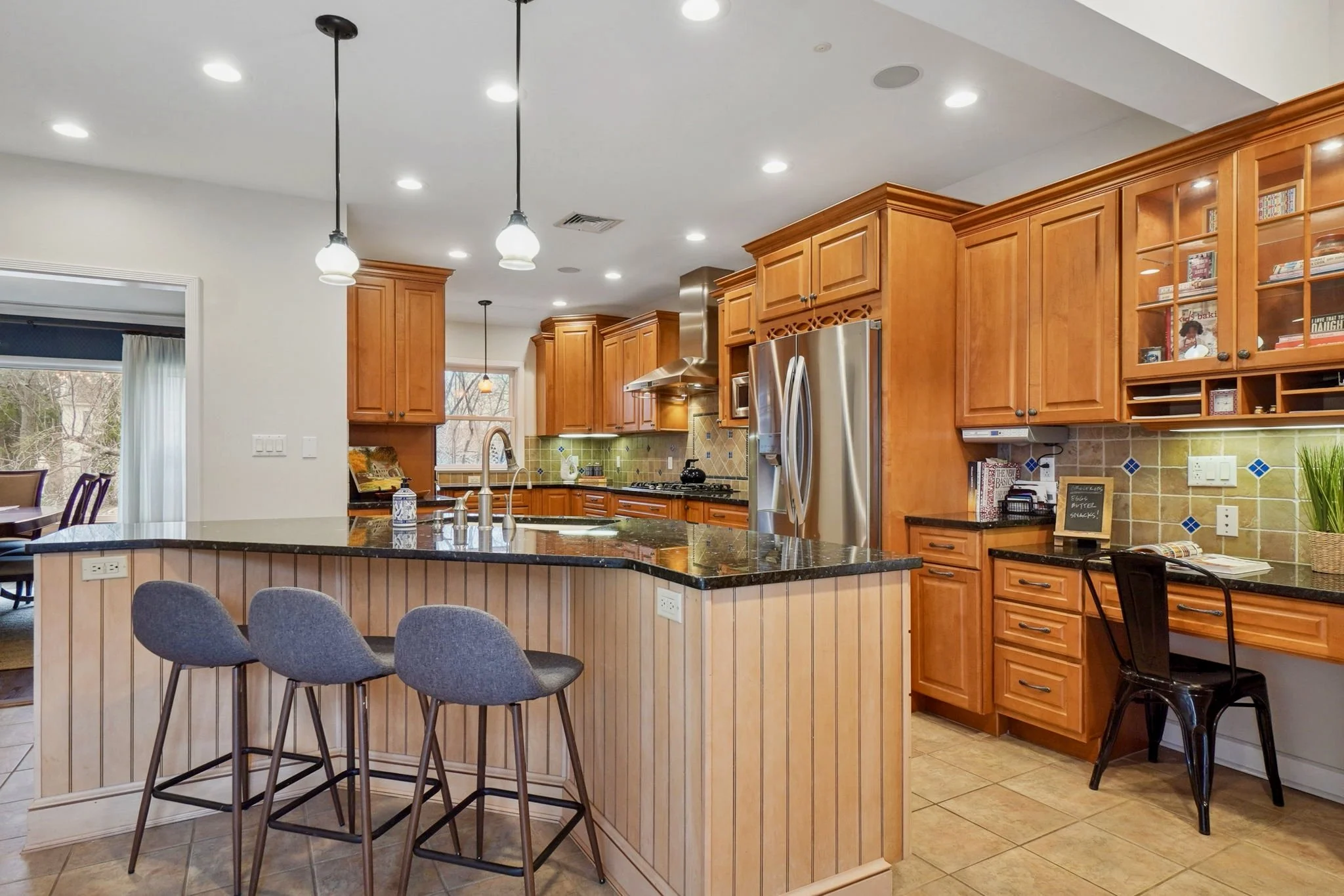 The first floor enjoys an inviting foyer flanked by a formal dining room and living room with a wood-burning fireplace. The stunning family room has a stone-faced wood-burning fireplace and a sliding door to the deck and backyard. The enormous eat-in kitchen is a chef's dream, with high-end appliances, granite countertops, and plenty of space for casual dining. You'll also love the mudroom, powder room, laundry room, and the convenient first floor office/bedroom, perfect for a guest or in-law suite.